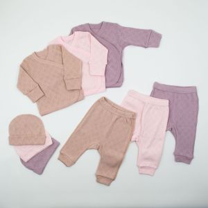 Практичний і м’який комплект із рібани жакард — чудовий вибір для новонародженого. Підходить для дому, прогулянок або як подарунок у пологовий будинок.
